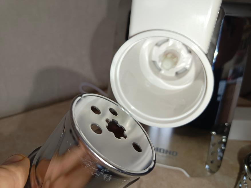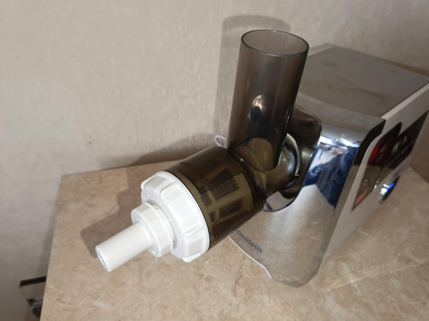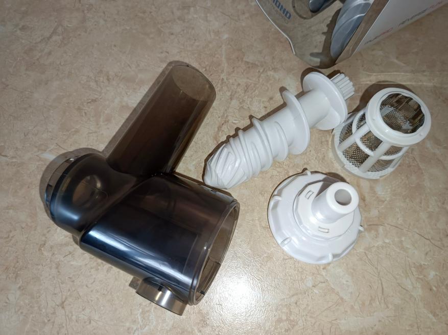 Вторая насадка — это соковыжималка. Насадка устроена по принципу шнековой соковыжималки, где продукты благодаря валу трутся об сито. Все детали пластиковые, кроме самого сита, оно из нержавеющей стали.