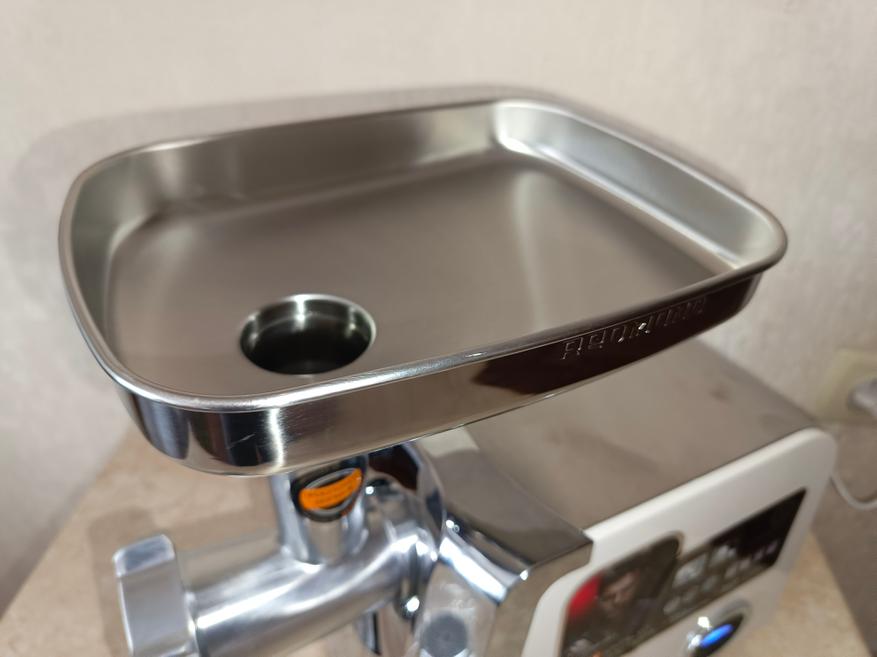 Ну и главный режим работы мясорубки — это приготовление фарша. В комплекте идет три насадки с диаметром отверстий 3 мм/4,5 мм/8 мм. Насадки хорошего качества и после мытья не чернеют и не ржавеют. Сверху устанавливается лоток из нержавеющей стали, у которого весьма большие борта. В целом, всё по классике.