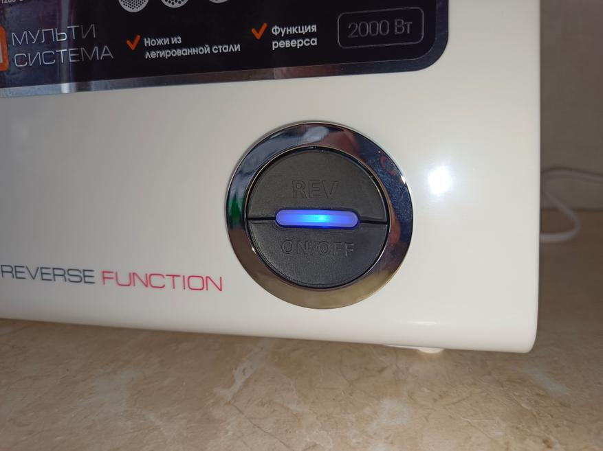 Управление расположено сбоку и представлено двумя кнопками. Верхняя кнопка запускает мясорубку, а нижняя — реверс. Если коротко, то классический корпус для электрической мясорубки.
