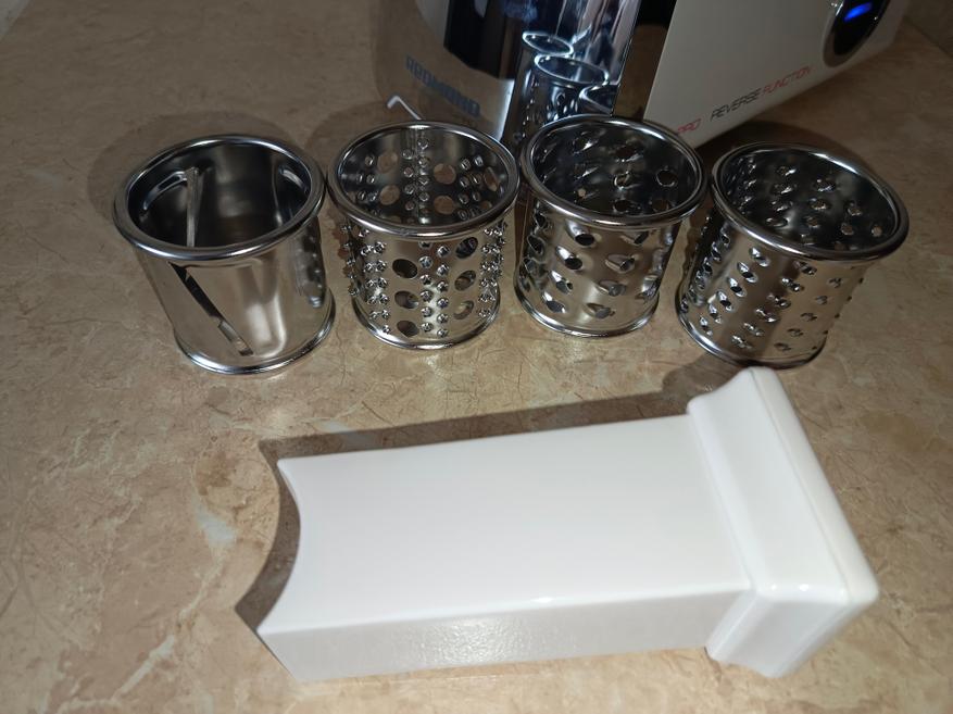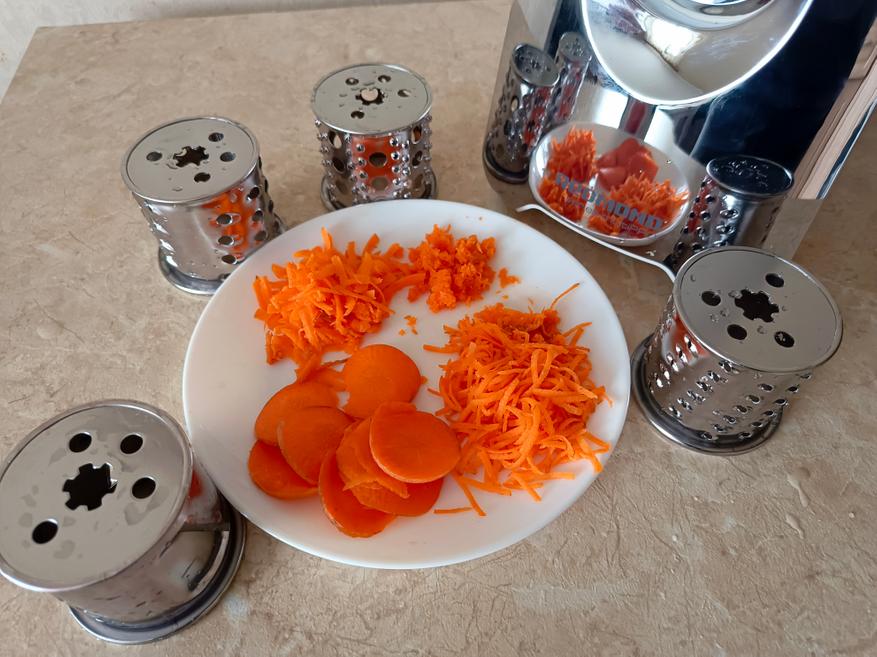 На видео можно посмотреть наглядно, как происходит измельчение продуктов на всех четырех насадках. Они очень острые и без проблем справляются с поставленной задачей. Например, очень удобно, когда готовите фарш для тефтелей, можно сразу натереть морковь для подливы.