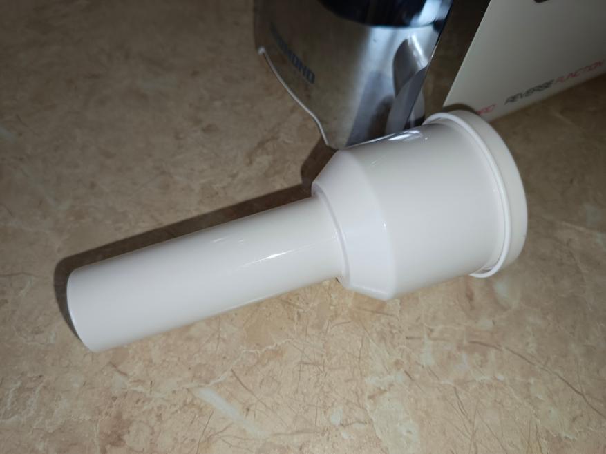Наверное, самый большой и единственный минус данной модели — это толкатель. Он является также боксом для хранения насадок для люля-кебаб и насадки для колбасы. Неудобно из-за того, что толкатель немного тяжелый и постоянно дребезжат насадки. Поэтому мне им не понравилось пользоваться.