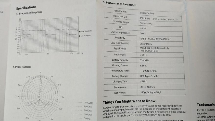 Ниже представлены основные технические характеристики из инструкции. Сразу отмечу, что в микрофоне используется встроенный аккумулятор и вручную можно регулировать чувствительность, а так же отсекать низкие частоты 75Hz и 150Hz.