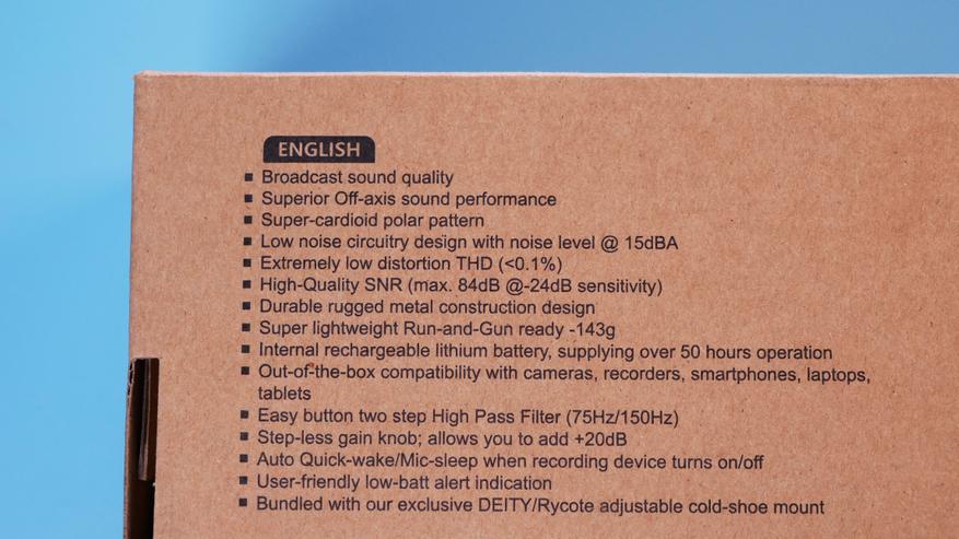 Поставляется микрофон Deity V-mic D3 Pro в картонной коробке, на обратной стороне которого приведены технические характеристики. От себя отмечу, что этот микрофон отлично подходит для съемки свадебного видео и влогов.