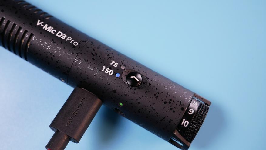 Корпус микрофона выполнен из алюминия, а на поверхности видны глянцевые вкрапления. Для включения и выключения микрофона используется одна физическая кнопка. Она же отвечает и за отсечение низких частот 75Hz и 150Hz, когда снимаете на улице в ветреную погоду. Напротив каждой частоты имеется светодиод, который позволяет понять какая частота сейчас отсекается.
