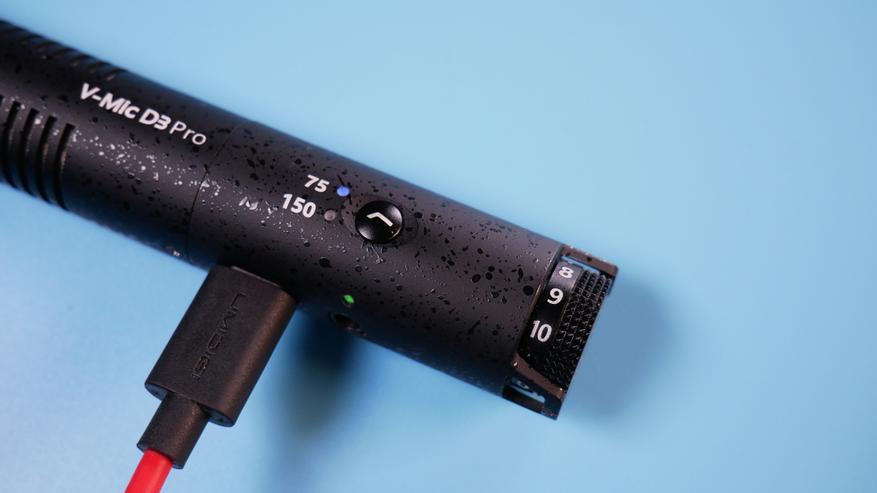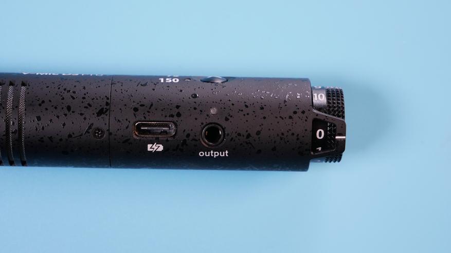 Чуть ниже на корпусе микрофона с алиэкспресс находится разъем для подключения кабеля для зарядки встроенного аккумулятора и гнездо для подсоединения к камере. При отключении камеры микрофон самостоятельно выключается и не тратит заряд встроенного аккумулятора, которого хватает на 50 часов. В торце микрофона Deity V-Mic D3 Pro находится колесико, которое увеличивает чувствительность микрофона, что позволяет в реальном времени увеличивать громкость записи звука, если она вас не устраивает. Профессионалы оценят.