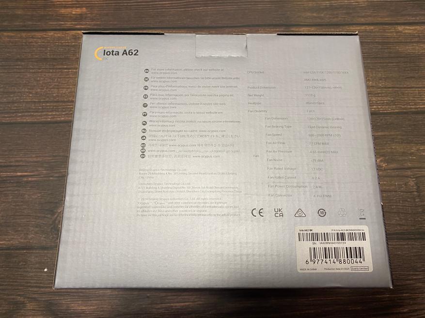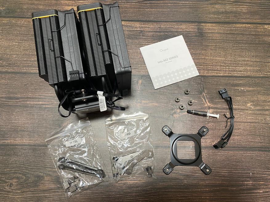 Простая картонная коробка в которой и поставляется процессорный кулер Ocypus Iota A62 BK, выполнена в сером цвете и, по аналогии с другими моделями, имеет на лицевой части изображение самого кулера, название модели, фирмы производителя. На оборотной части пользователь может ознакомиться с подробными техническими характеристиками. Открыв коробку мы можем наблюдать, что кулер весьма надежно уложен во вспененный материал, а вся комплектация дополнительно уложена в дополнительную картонную коробку. Комплектация данной модели может и является стандартной, но она содержит всё необходимое для беспроблемной установки кулера прямо из коробки. А именно: Кулер Ocypus Iota A62 BK, 2 вентилятора 120 x 120 мм, крепежный комплект для сокета Intel и AMD, термопаста, инструкция по установке, Y-разветвитель для подключения вентиляторов, наклейка Ocypus, бэкплейт.
