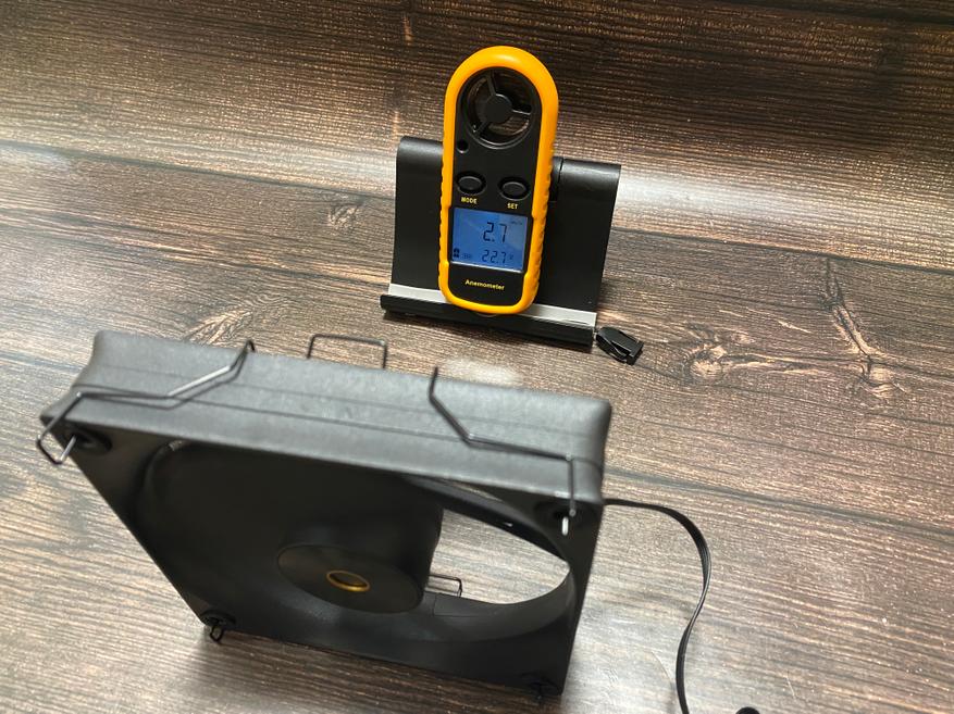 При помощи анемометра замерил силу воздушного потока. На минимальных оборотах получаем 1 метр в секунду, а на максимальных оборотах 2.7 метра в секунду.
