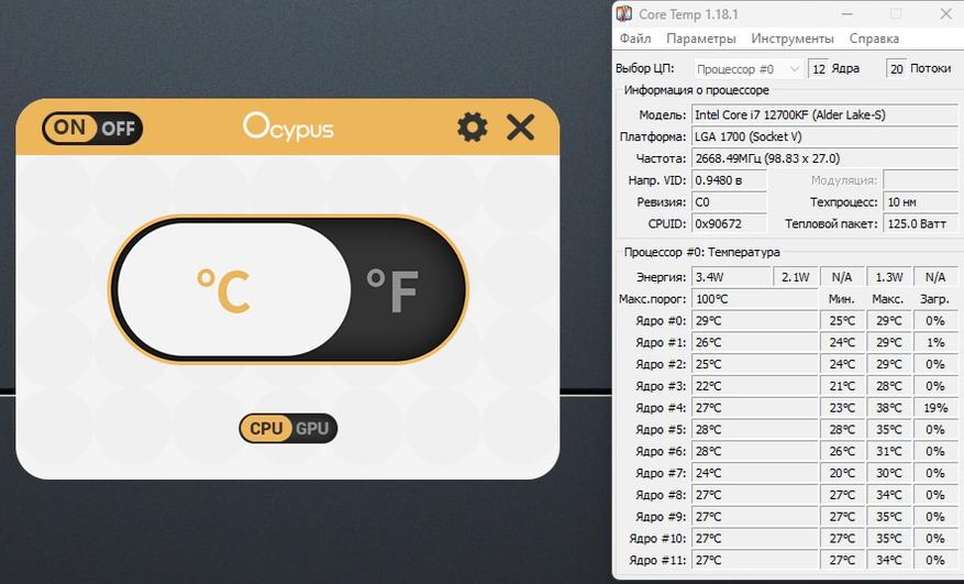 Без нагрузки на процессор получаем всего 25 градусов. Обороты вентиляторов — автоматически.