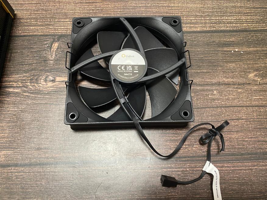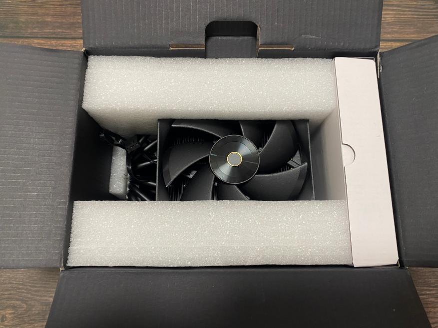 Вентиляторы, как и сам радиатор выполнены в черном цвете. Крыльчатка вентилятора имеет 7 лопастей. Установленные вентиляторы имеют возможность регулировки оборотов от 500 до 2000 об/мин. Вентиляторы имеют следующую маркировку DF1202512CM. В основе вентилятора установлен гидродинамический подшипник с большим ресурсом работы. Максимальный воздушный поток 77 CFM. Для подключения используется 4 PIN разъем. На углах корпуса вентилятора имеются резиновые накладки для предотвращения передачи вибрации на радиатор. Ну и конечно, для установки вентилятора используются стандартные металлические скобы. В комплект производитель любезно положил маленький шприц с термопастой, на шприце нет маркировки и информации о теплопроводности.
