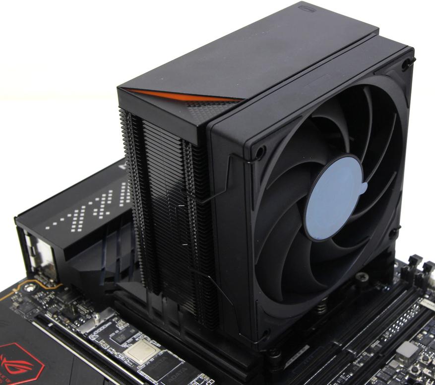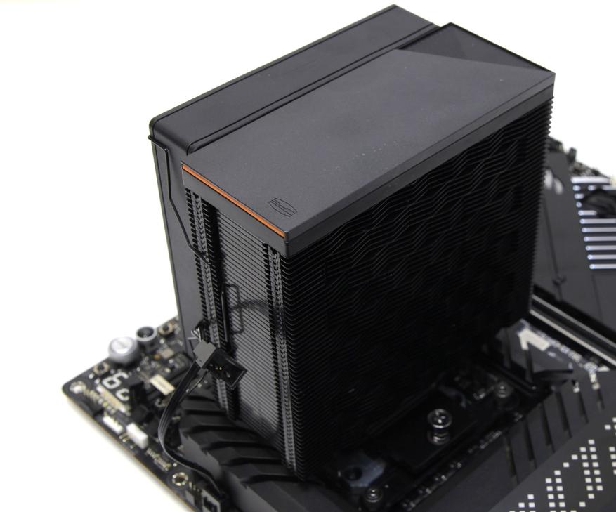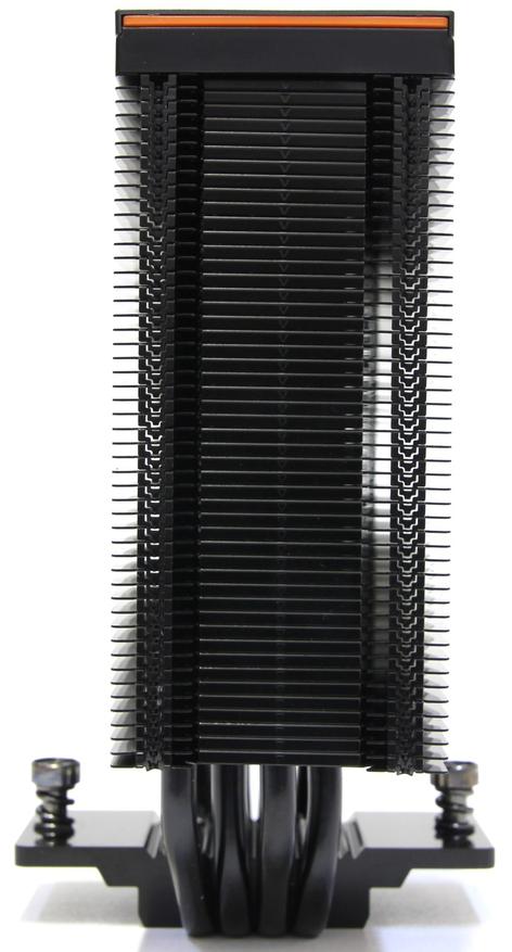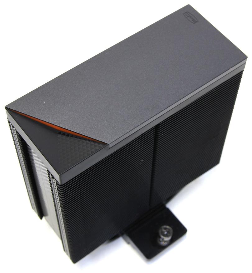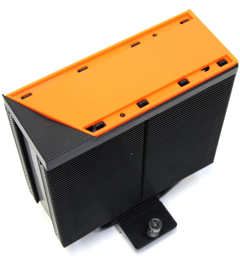Верхушка представляет собой достаточно сложную конструкцию и видимо производитель здесь делал ставку на эстетику. В самом верху находится алюминиевая крышка, на которой расположен маленький логотип CPS. Под ней оранжевая пластиковая вставка и чёрное пластиковое основание всего этого бутерброда. Первые две детали фиксируются защёлками, а последняя прикручена к радиатору двумя саморезами. Выглядит это достаточно интересно, но вместо пластиковой вставки можно было добавить модуль с подсветкой, что не мешает это осуществить позднее и представить ещё одну модификацию.