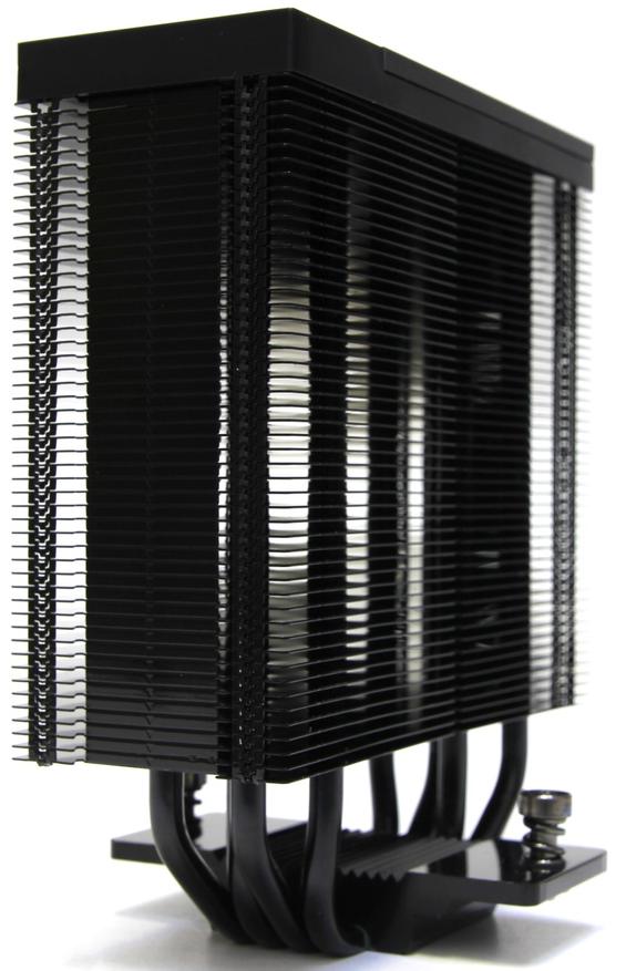 Размеры кулера с вентилятором составляют 130 х 80 х 155 мм. Это классический башенный кулер с четырьмя тепловыми трубками, которые загнуты в форме буквы U. В данном случае используется технология прямого контакта тепловых трубок с тепло-распределительной крышкой процессора. Здесь в основании трубки очень плотно расположены друг к другу, а остальная часть корпуса изготовлена из алюминия. Поверхность хорошо выровнена и закрыта защитной плёнкой.