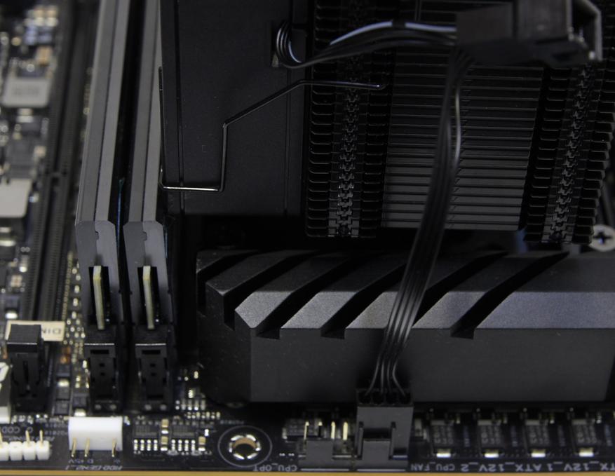 Далее уже можно устанавливать память. На этом этапе у кого-нибудь могут возникнуть проблемы совместимости из-за слишком высоких радиаторов. Я этот вопрос проработал и у меня планка стояла практически вплотную к вентилятору. Всё это нужно учитывать ещё до покупки кулера.