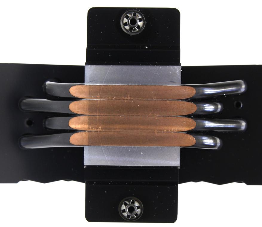 Трубки медные, диаметром 6 мм. Они проходят через 8 отверстий в 50 пластинах. Следов пайки я не заметил потому, что всё выкрашено в чёрный цвет. Производитель заявляет, что это гальваническое покрытие чёрным никелем. Я ничего об этом методе не знал, но почитал, и действительно такие вещи делают даже у нас в России.