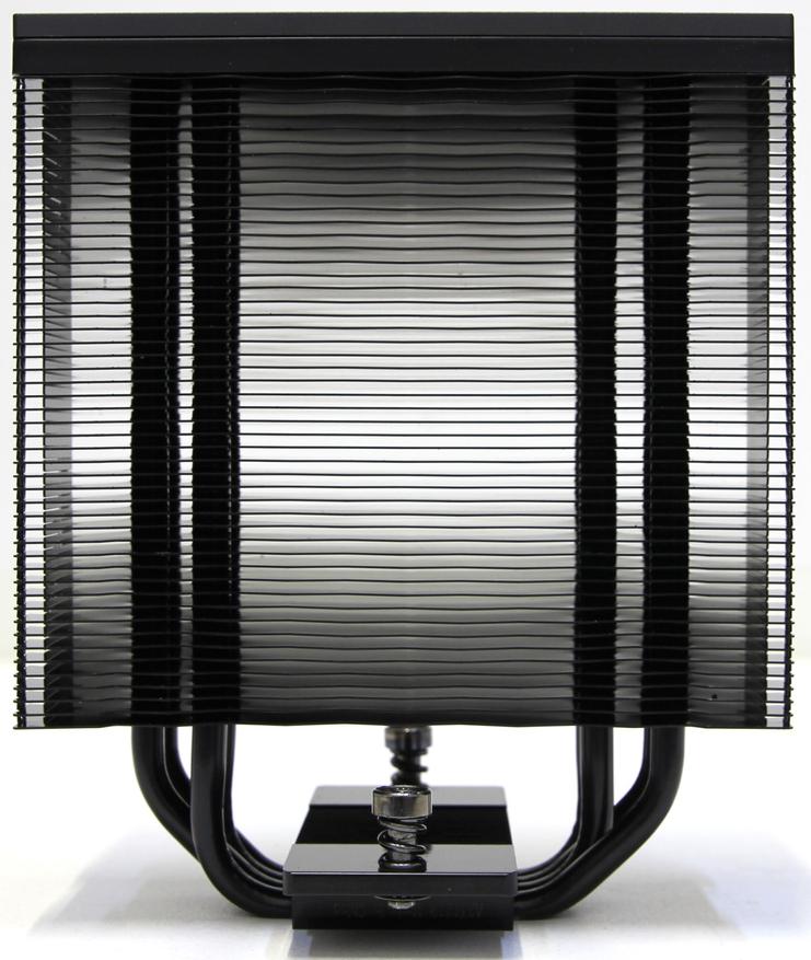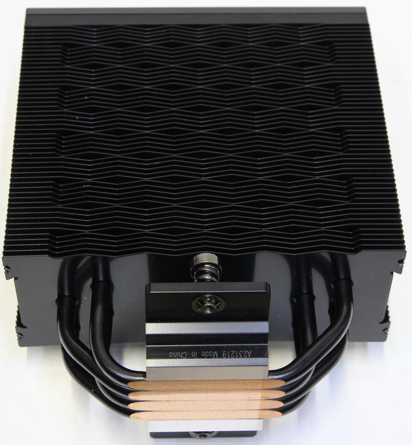 Если посмотреть на радиатор сбоку, то заметно, что он не симметричный. Также сами пластинки немного отличаются и образуют с противоположной от вентилятора стороны, своеобразный узор. Пластины размером 130 х 55 мм, а толщина 0,4 мм. Расстояние между пластин около 2 мм. Общая площадь поверхности пластин составляет приблизительно 7150 кв. см. Вес всего радиатора с верхней декоративной крышкой около 600 г.