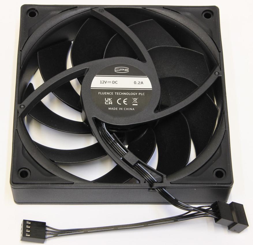 Вентилятор размера 120 х120 х 25 мм, выглядит достаточно качественным. Он основан на мощной раме, где по углам можно заметить антивибрационные подушки. Девять лопастей немного закручиваются в спираль. Диапазон скорости вращения 500 — 2200 об/мин. Производитель заявляет об уровне шума 32 дБ. Здесь не совсем понятны расчёты: какая дистанция до измерительного прибора и смонтирован ли вентилятор на кулер, поэтому всё это предстоит ещё проверить. Номинальное напряжение 12 В, сила тока 0,2 А. С обратной стороны двигателя есть наклейка, но информации на ней мало. Например, не указано наличие гидродинамического подшипника. Спереди есть ещё одна наклейка, но на этот раз защитная, чтобы не поцарапалась пластинка под ней.