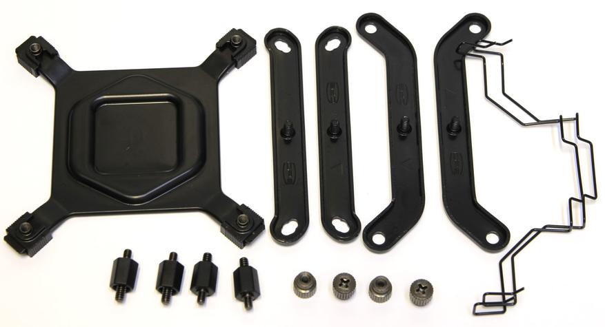 Там можно обнаружить инструкцию, тюбик с пастой и удлинитель 4-pin FAN для вентилятора. Также там расположен комплект крепежа. Всё разложено по отдельным пакетам. В комплекте есть металлическая пластина для платформ Intel LGA 1700/1200/115X. На четырёх концах находятся металлические втулки под стандартные крепёжные отверстия на материнских платах. Поскольку размеры разные, то втулки могут перемещаться и фиксироваться в двух положениях, благодаря пластиковым фиксаторам. Ещё в комплект входят четыре адаптера, на которые опираются монтажные пластины. Пластин два комплекта: один для Intel, а второй для AMD. Есть четыре гайки и две скобы для фиксации вентилятора.
