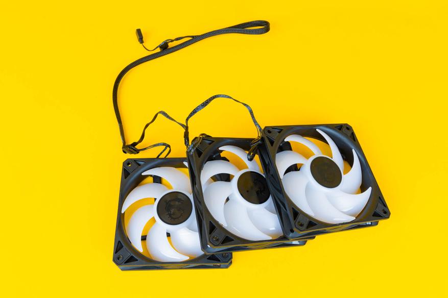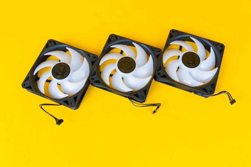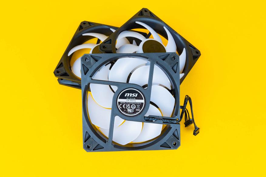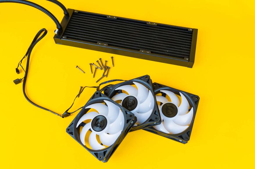 Комплектные семилопастные 120 мм вентиляторы в MAG CoreLiquid I360 производятся компанией Cooler Master, имеют маркировку FA12025M12LPAI010 и при напряжении в 12 В сила тока составляет до 0,3 А. В качестве подшипника используется LDB Bearing.