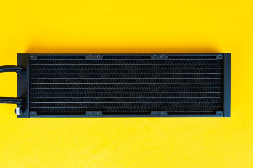 Современные радиаторы жидкостных систем в целом схожи между собой и имеют аналогичные характеристики. Радиатор в MAG CoreLiquid I360 имеет габариты 394 х 119.2 х 27 мм, с толщиной оребрения — 20 мм. Плотность оребрения — 21 FPI. В конструкции предусмотрено 14 плоских каналов, расстояние между которыми составляет 9 мм.