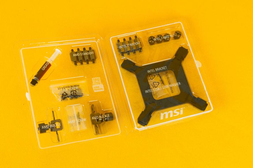 Особенно хочется выделить пластиковый контейнер, в котором находится комплектация, состоящая из: пластикового бекплейта, крепежных элементов и тюбика термопасты. Во-первых, этот контейнер выглядит стильно и занимает мало места. Во-вторых, каждый элемент расположен в отдельной ячейке и подписан, что сводит к минимуму риск перепутать крепления при установке MAG CoreLiquid I360.