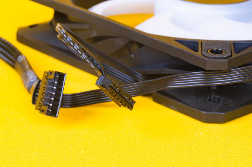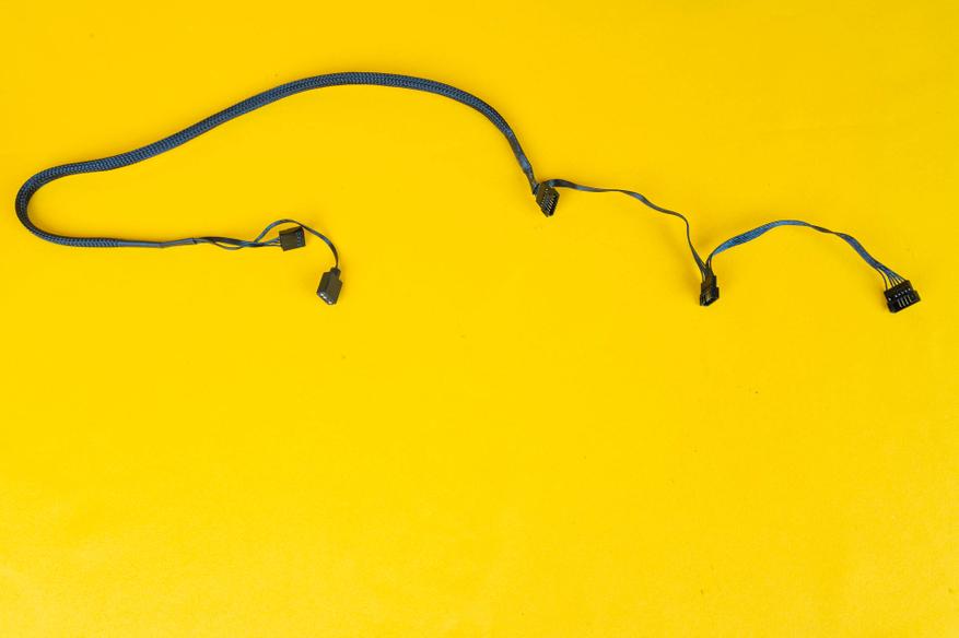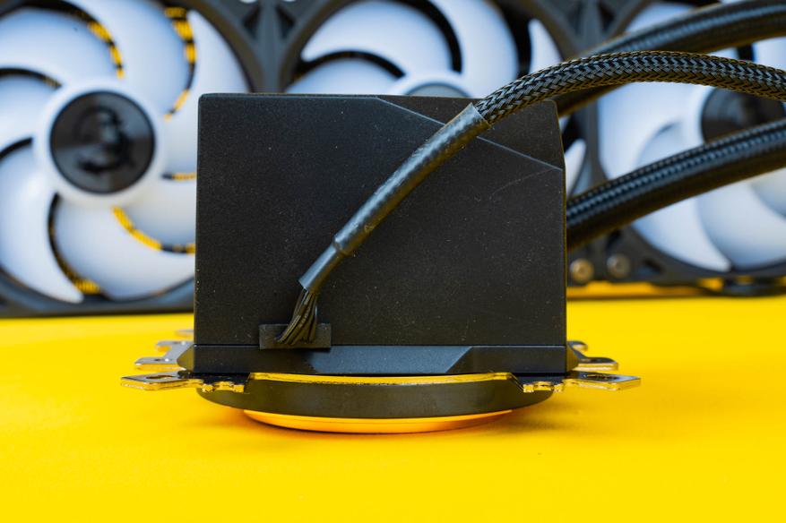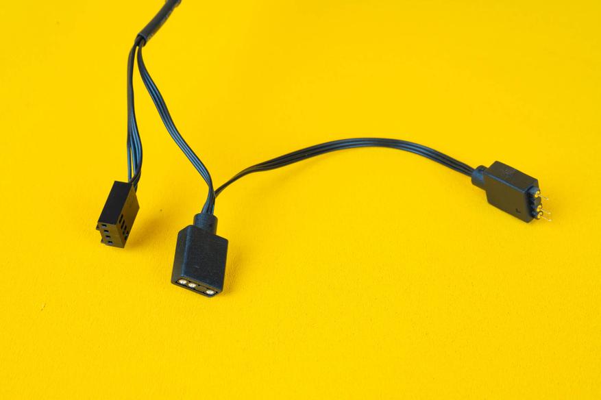 С одной из боковых сторон корпуса помпы-водоблока выходит кабель, который разветвляется на несколько кабелей. Один кабель позволяет управлять оборотами помпы, а на втором кабеле расположены два порта для подсветки 3-Pin 5V ARGB. Это позволит синхронизировать работу всех элементов подсветки.