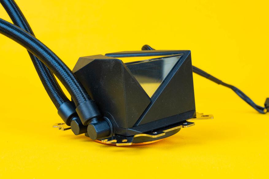 С противоположной стороны находятся Г-образные поворотные фитинги, к которым крепятся шланги, ведущие к радиатору. К слову, шланги, соединяющие водоблок с радиатором, имеют чёрную синтетическую оплётку.