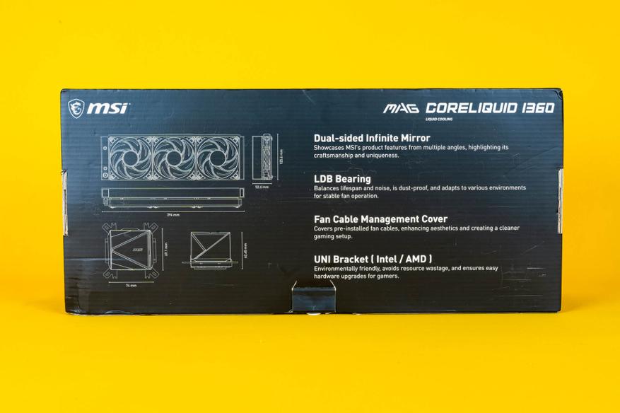 Перед распаковкой вы можете рассмотреть внешний вид системы жидкостного охлаждения MSI MAG CoreLiquid I360 и узнать ее технические характеристики и габариты.