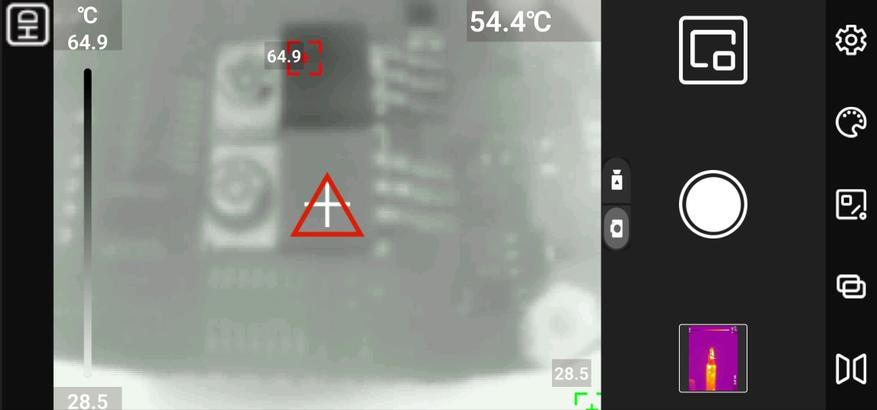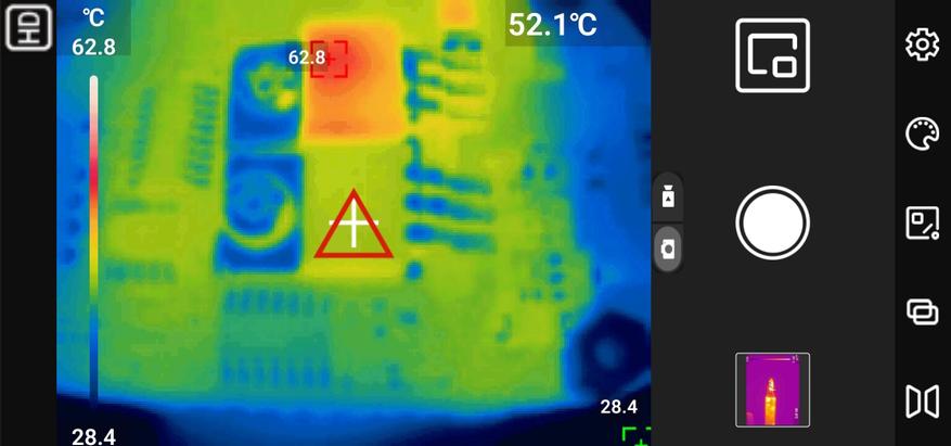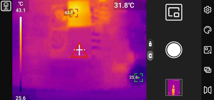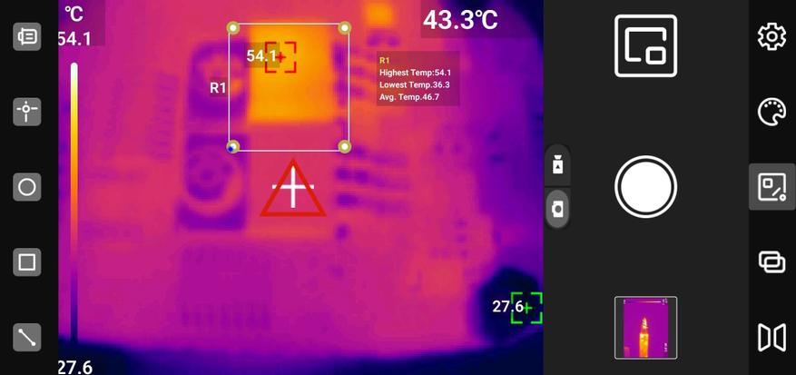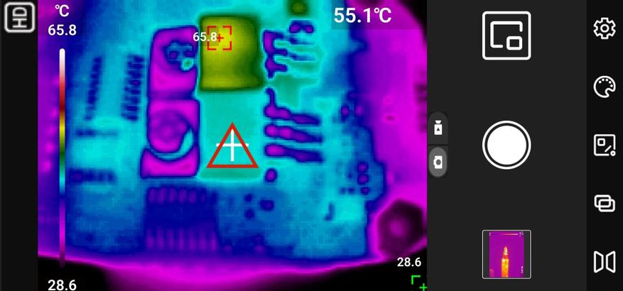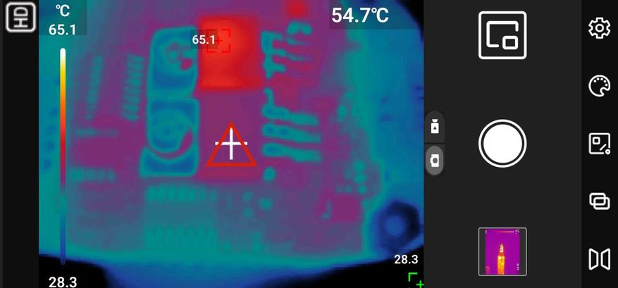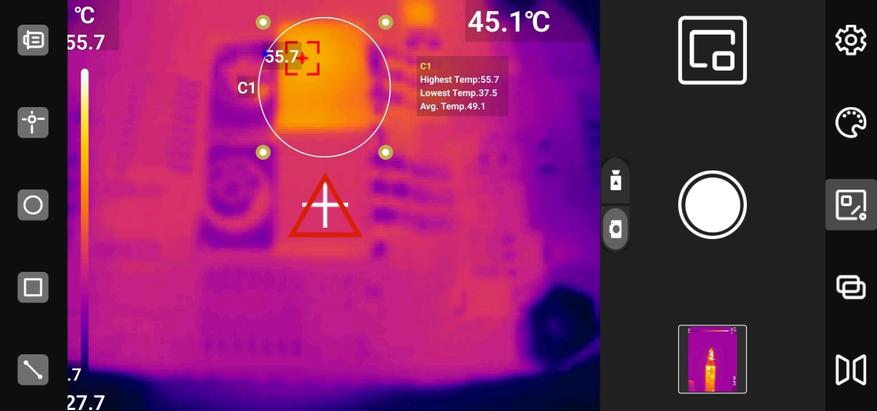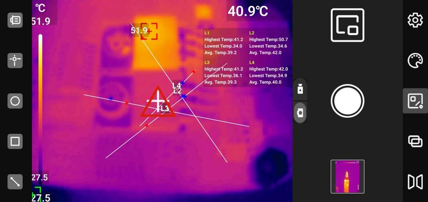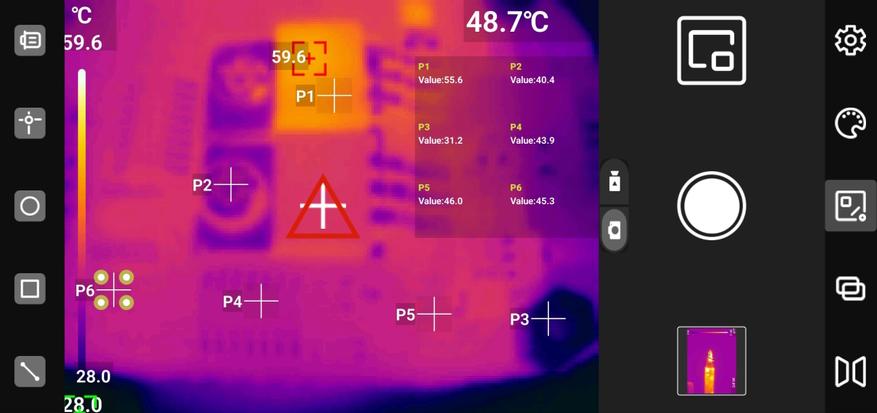 Инструменты измерения работают просто. Тапаешь по экрану — ставишь маркер, их доступно до 6 штук. Каждая точка показывает актуальное значение температуры, плюс запоминает минимум и максимум за время наблюдения. Если температура выходит за критический порог, цвет маркера меняется — сразу заметно.