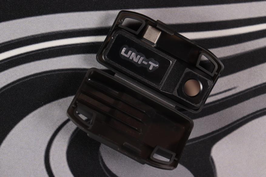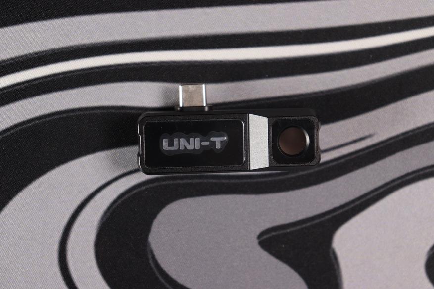 UTI120Mobile выглядит как миниатюрный блок с USB Type-C разъёмом, выступающим с одной стороны, и тепловизионной линзой — с другой. Корпус изготовлен из чёрного металла с матовой текстурой, что придаёт устройству строгий вид и защищает от отпечатков пальцев. Габариты тепловизора крайне компактны — он едва превышает размер USB-флешки, что позволяет носить его в кармане или на связке ключей.