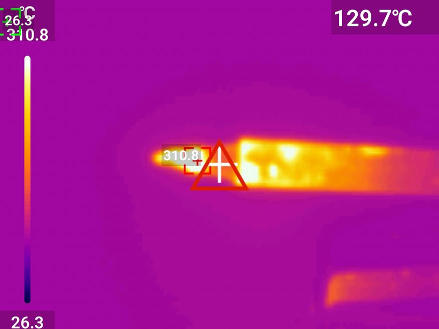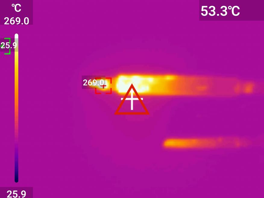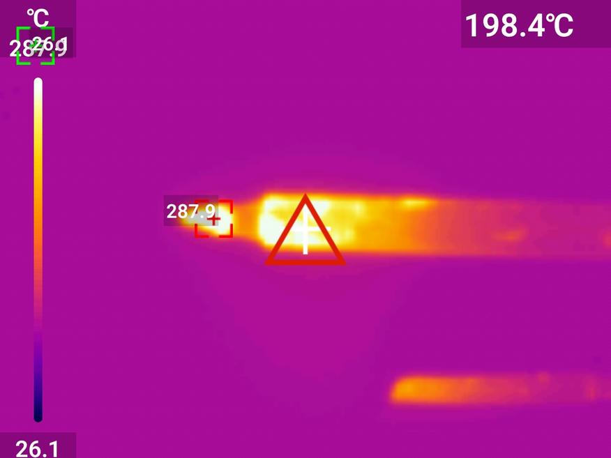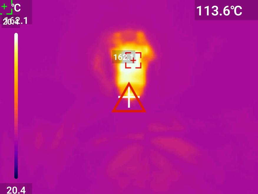 Для проверки возможностей тепловизора протестировал его на разных задачах и привел сравнение. Первым делом взял паяльник TS101 и прогнал его через несколько температурных режимов. При 250°C жало паяльника светилось ярко-жёлтым на термограмме, чётко выделяясь на фоне. Подняв температуру до 300°C, увидел, как зона нагрева расширилась — прибор показывал реальную картину распределения тепла вдоль наконечника. На максимуме в 320°C весь рабочий конец жала превратился в почти белое пятно с температурой, приближающейся к пределу измерения. Разрешение 120x90 позволяет увидеть не только общий нагрев, но и градиент температуры от кончика к держателю.