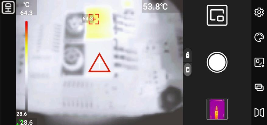 Для взаимодействия с тепловизором понадобится фирменная программа Thermal Mobile из Google Play. При первом соединении Android сам предлагает открывать это приложение автоматически — удобно, не нужно каждый раз лезть в меню. Запускается всё быстро, буквально через секунду после подключения уже видишь картинку. Главный экран занимает термограмма в реальном времени, сверху показаны граничные значения температуры в кадре, а внизу собраны основные кнопки управления. Видео идёт со скоростью 25 кадров — движение отображается плавно, без рывков.
