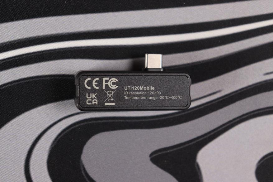 На одной из граней корпуса нанесена маркировка с основными характеристиками: модель UTi120Mobile, разрешение IR 120x90, температурный диапазон -20°C~400°C, а также знаки сертификации CE, FC, UKCA. Линза объектива слегка утоплена в корпус, что снижает риск царапин при повседневном использовании. USB разъём имеет стандартный форм-фактор Type-C и подходит для современных смартфонов с этим портом.