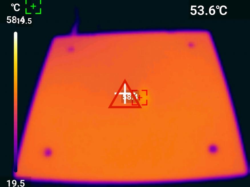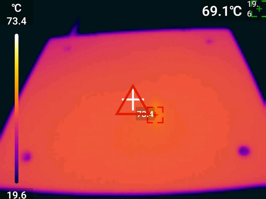 Следующим тестом стал 3D-принтер. Включил подогрев стола до 50°C — на экране сразу проявилась равномерная оранжевая поверхность платформы, температура распределена ровно, без холодных зон. Подняв температуру до 70°C, увидел более насыщенный цвет — стол прогрелся равномерно по всей площади.