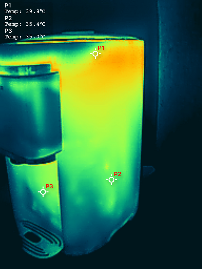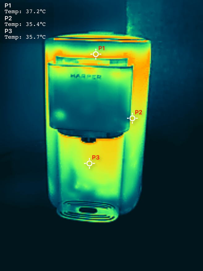 Если посмотреть на термопот при помощи тепловизора, то можно сделать вывод, что корпус вполне безопасен и обжечься у вас точно не получится.