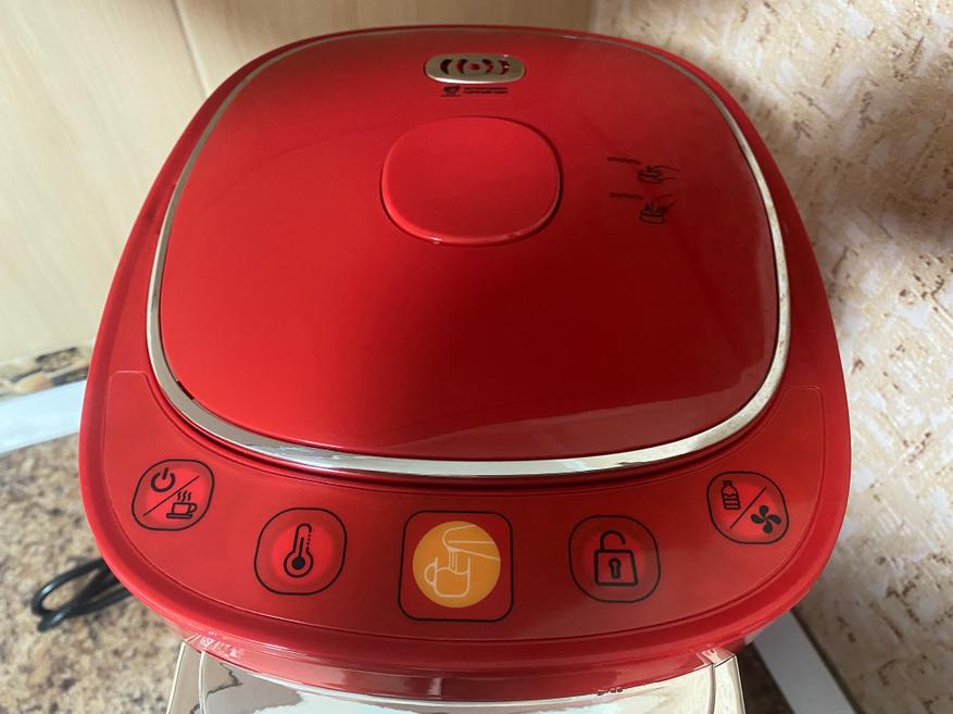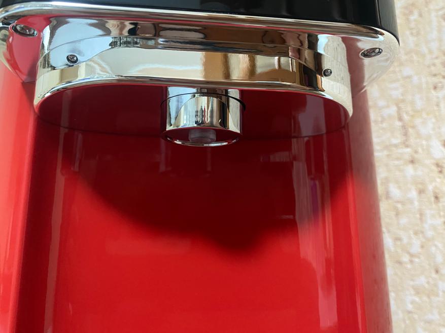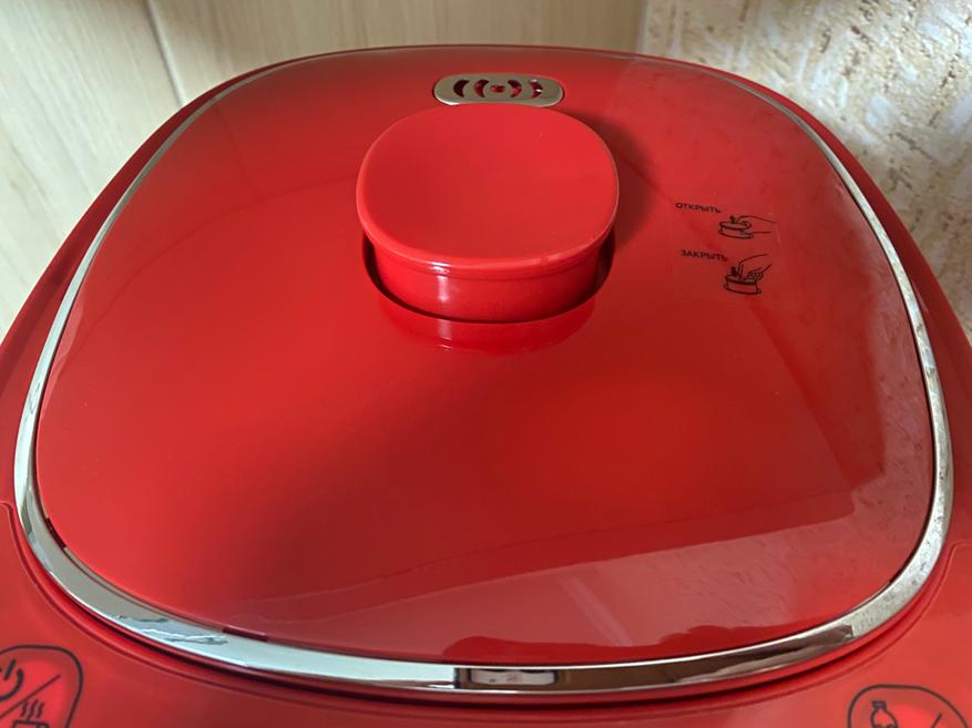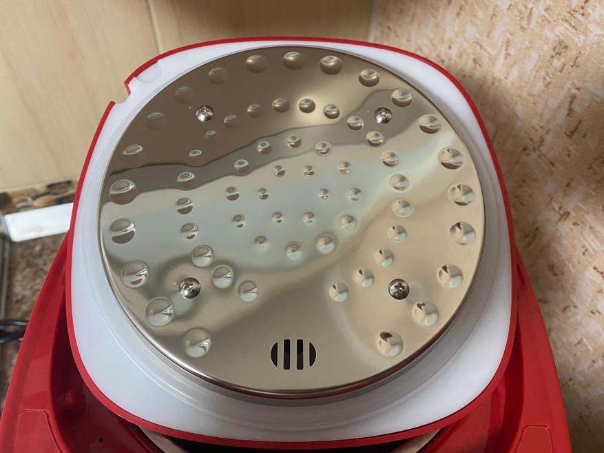 На верхней части также находится массивная крышка, которая не откидывается на петлях как обычный электрический чайник, а снимается полностью при помощи объемной пластиковой кнопки/ручки. На оборотной части крышки имеются отверстия для выпуска избыточного давления горячего пара. Кстати, внутренняя часть крышки сделана из нержавеющей стали.