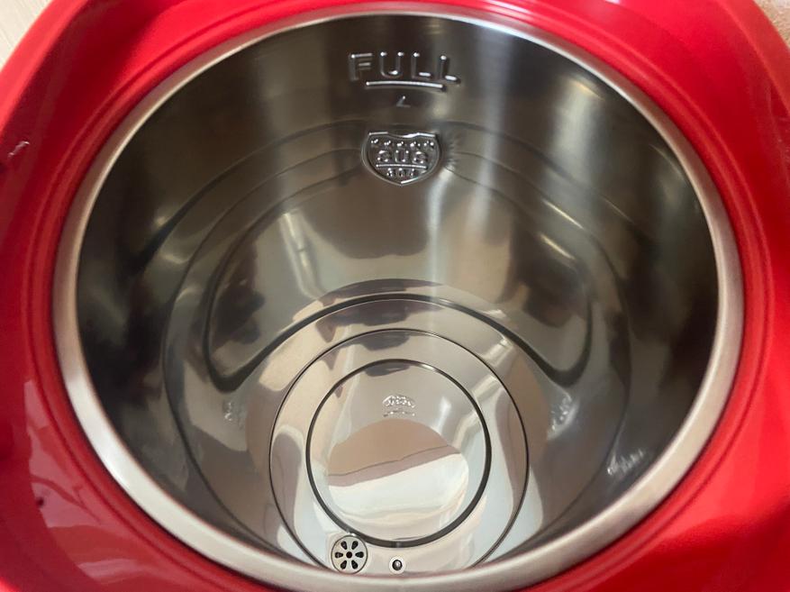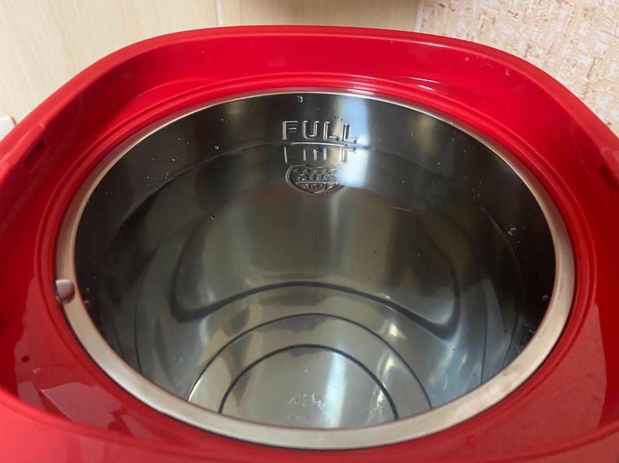 Внутренняя колба также выполнена из нержавеющей стали и не склонна к коррозии. На верхней части колбы имеется надпись «FULL», которая обозначает максимально допустимый уровень воды. На нижней части колбы расположены два датчика, один из которых определяет наличие воды, а другой определяет температуру. Максимально возможный объем в резервуаре 5 литров, но если придерживаться максимальной отметки, то полезный объем составит 4.8 литра.