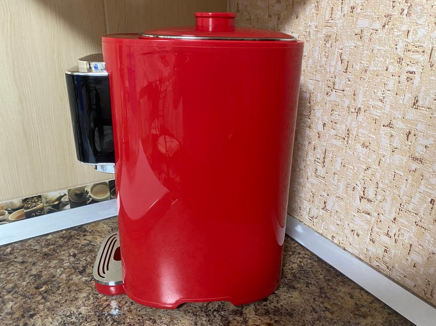 Корпус термопота Harper HTP-5T01 выполнен, в моем случае, в красном цвете, хотя как уже говорилось выше, данная модель имеет весьма богатый выбор цветов, а именно: красный, белый, черный, голубой, оранжевый, бежевый. Корпус имеет глянцевую поверхность и, я думаю, темные цвета будут очень хорошо собирать отпечатки пальцев и других загрязнений. Лицевая часть термопота имеет большой дисплей на котором отображается текущая температура воды, выставленная температура, индикатор включенного режима поддержания температуры, индикатор принудительного охлаждения воды при помощи вентилятора, индикатор отсутствие воды.