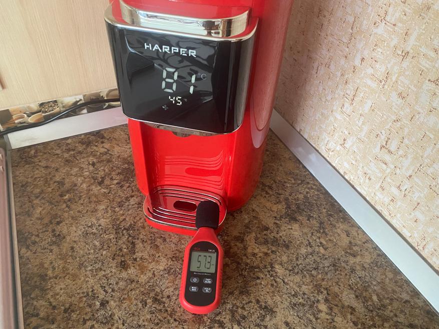 Весит термопот 2.7 кг. Во время закипания воды уровень шума составляет 57 dB.