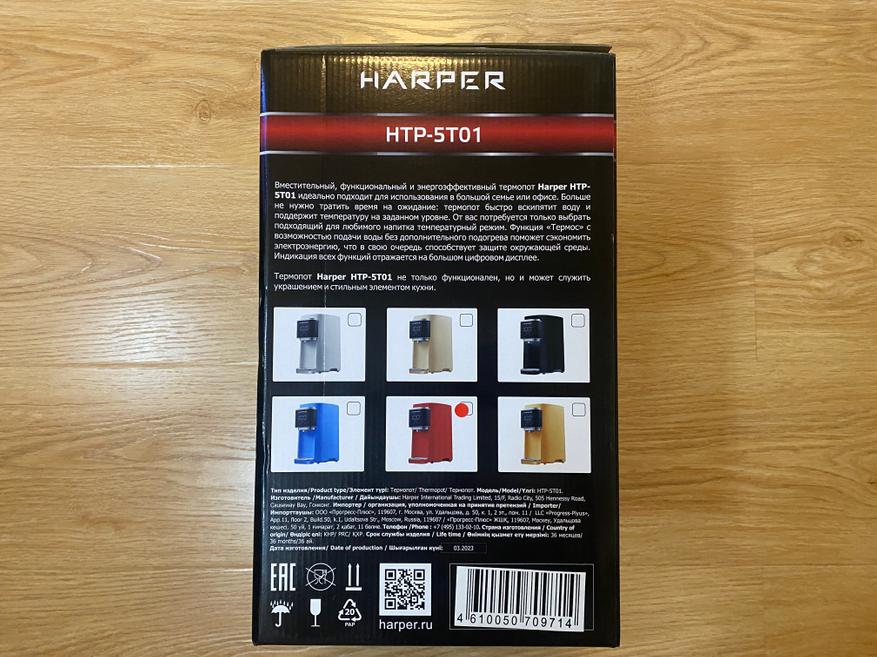 Термопот упакован в черную картонную коробку с пластиковой ручкой на верхней части, для удобства во время переноски. На коробке по стандарту имеется цветное изображение термопота, так же имеются технические характеристики, ну и конечно данная модель термопота имеет 6 цветов на выбор. Что нам дает большой выбор цветовых решений? а оно дает нам подобрать термопот под любой интерьер как кухонного помещения, так и офисного. При открытии коробки мы можем наблюдать следующую комплектацию, а именно: Термопот Harper HTP-5T01, подставку под кружку, гарантийный талон, инструкцию по эксплуатации. Для обеспечения безопасности во время транспортировки термопот зафиксирован внутри коробки при помощи вспененного материала.