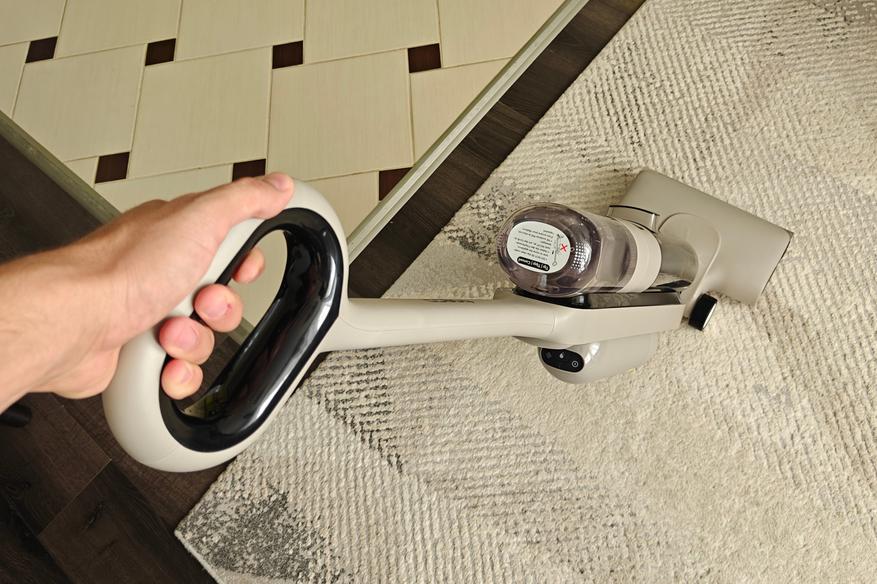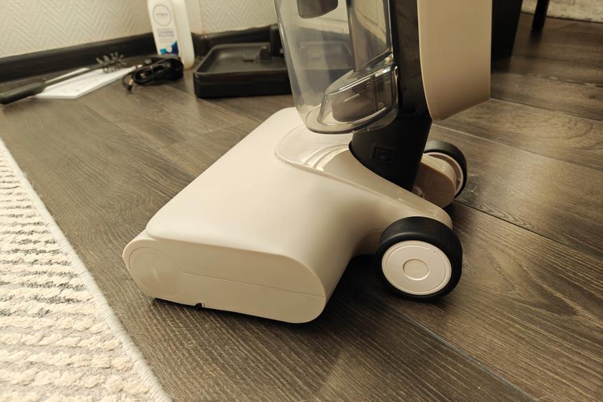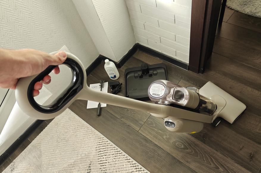 Tineco iFloor Y2 пришел в почти собранном состоянии: нижняя часть с щеткой вообще не снимается, а резервуары для воды уже были вставлены в корпус. Оставалось только присоединить ручку, вошедшую в паз с характерным щелчком. Пылесос готов к работе.