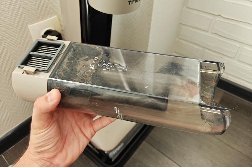 Док-станция здесь — пластиковый лоток для хранения, предотвращающий протекание воды после самоочистки и заряжающий пылесос. Лоток компактный (27 x 27 см) пылесос на нем стоит устойчиво.