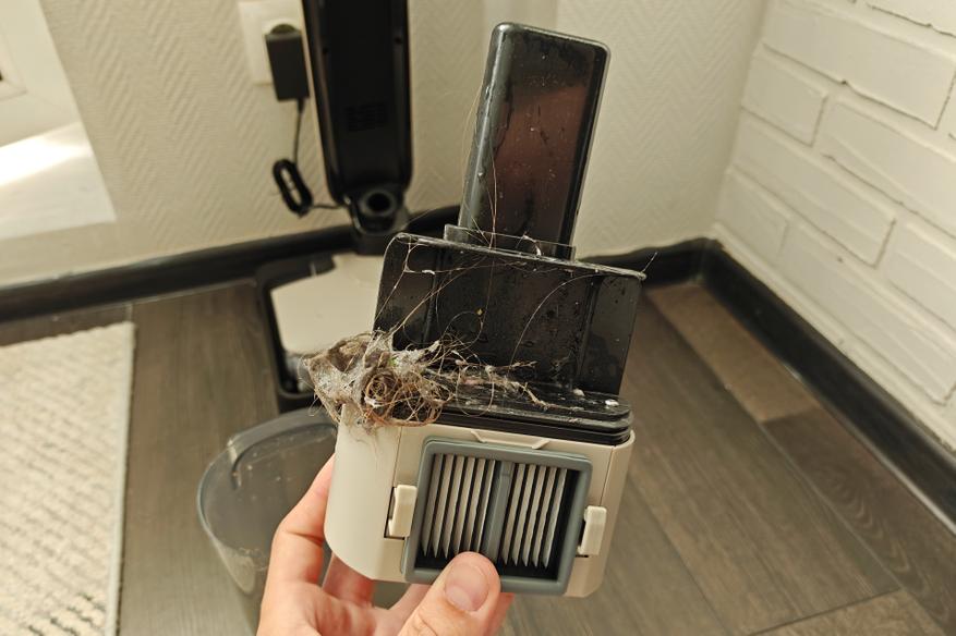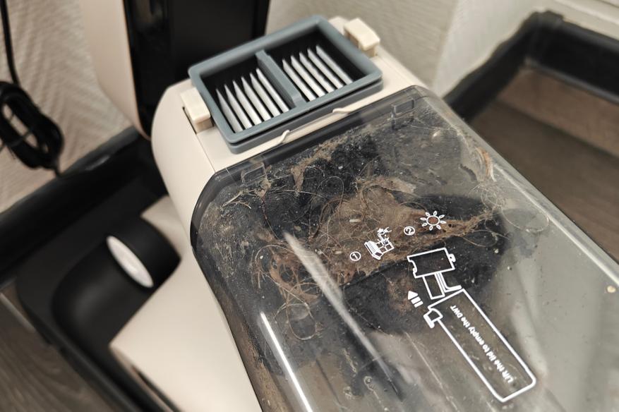 Очистка так же проста, как и использование. После уборки пылесос достаточно поставить на пластиковый лоток из комплекта и нажать кнопку самоочистки. За 30 секунд система промывает щетку и трубки чистой водой. Важно только убедиться, что воды достаточно в резервуаре. Затем нужно обязательно вылить грязную воду из бака и сполоснуть его. Щетку рекомендуется снять и просушить. Волосы и шерсть не наматываются туго и легко снимаются с края валика. Это возможно благодаря специальным скребкам (система от запутывания Anti-Tangle), которые предотвращают спутывание волос и шерсти домашних животных.
