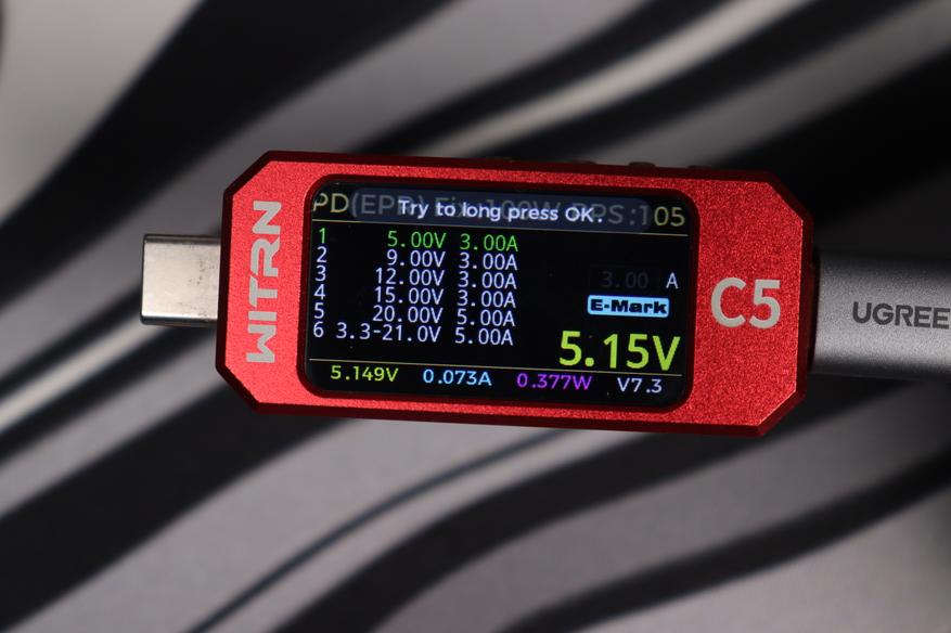 При включении попадаешь на главный экран с основными параметрами. Напряжение, ток, мощность — все с высокой точностью отображается на ярком дисплее. Как было и в случае с WITRN U3, настроек в тестере полно, от самых базовых до кастомизации меню, кроме того можно скопировать E-Marker с других кабелей Type-C, дабы зарядка позволяла выжать необходимый максимум.