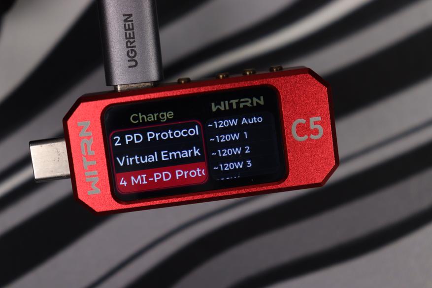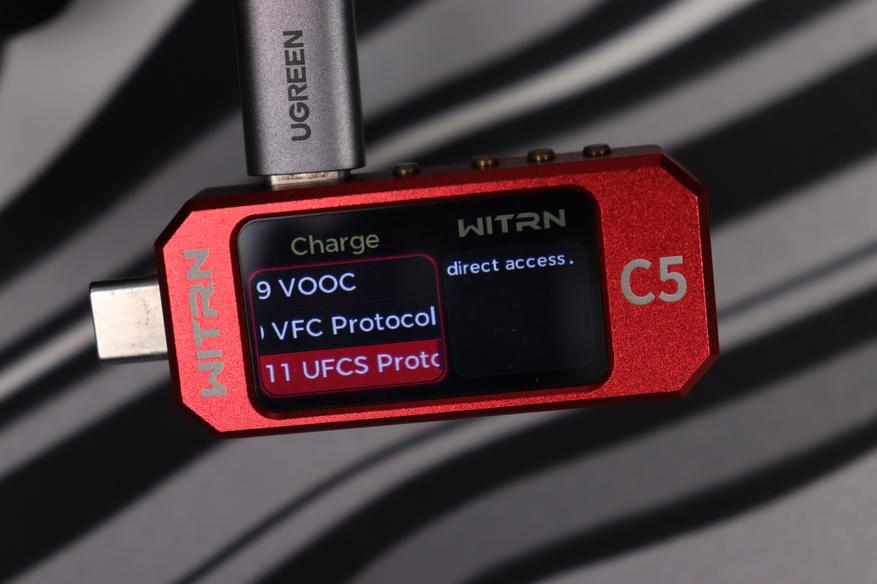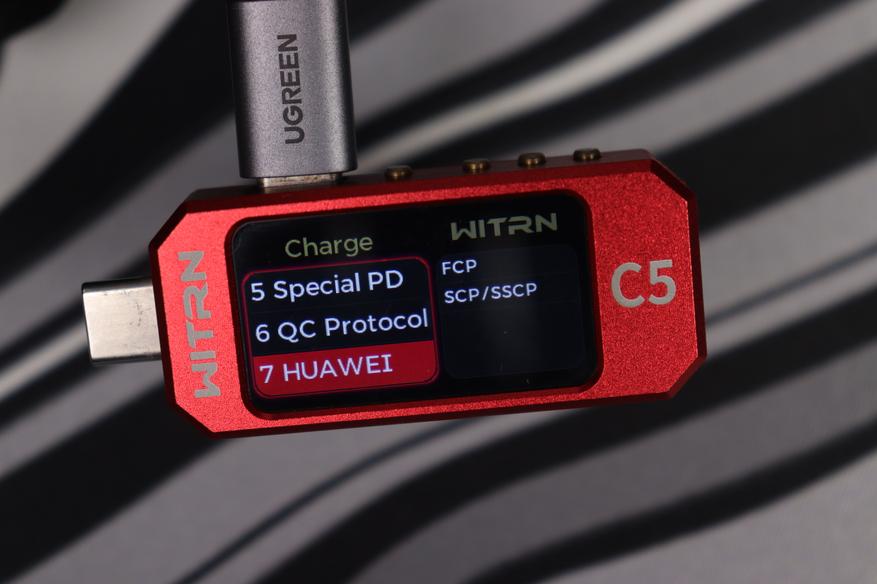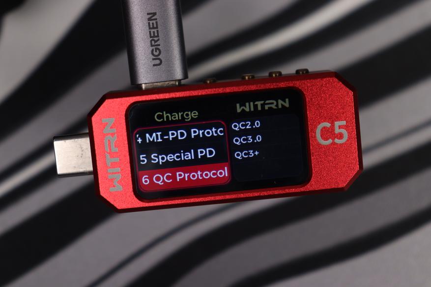 Дисплей показывает уровни напряжения на информационных линиях D+ и D-, что дает возможность определить активный протокол ускоренной зарядки. Устройство способно распознавать и инициализировать широкий спектр зарядных протоколов: QC1.0, QC2.0, QC3.0, QC3+, QC4.0, QC4+, QC5, AFC, FCP, SCP, Apple, PD3.0, PD3.1, MTK, PPS, VOOC, Super VOOC. В настройках доступен режим автоматического определения протоколов либо возможность принудительного выбора требуемого стандарта зарядки.
