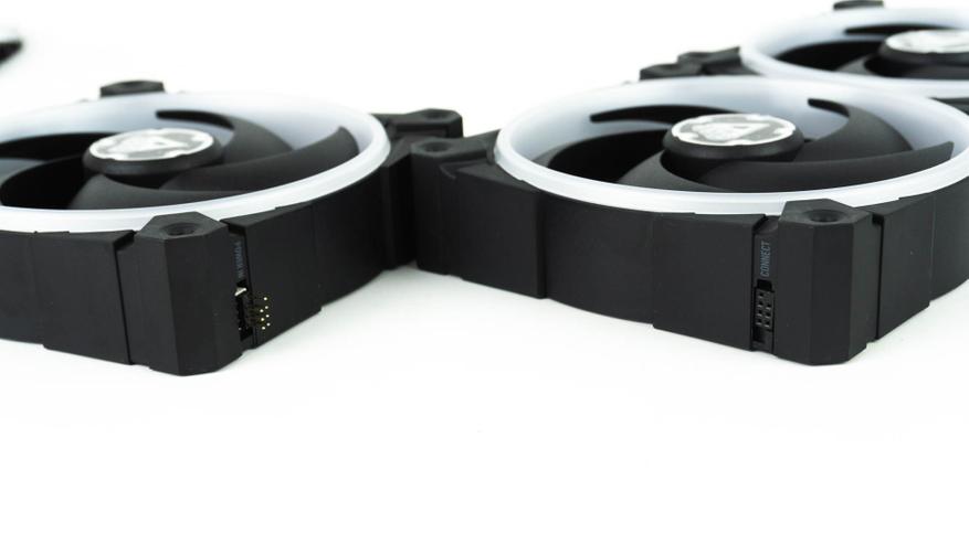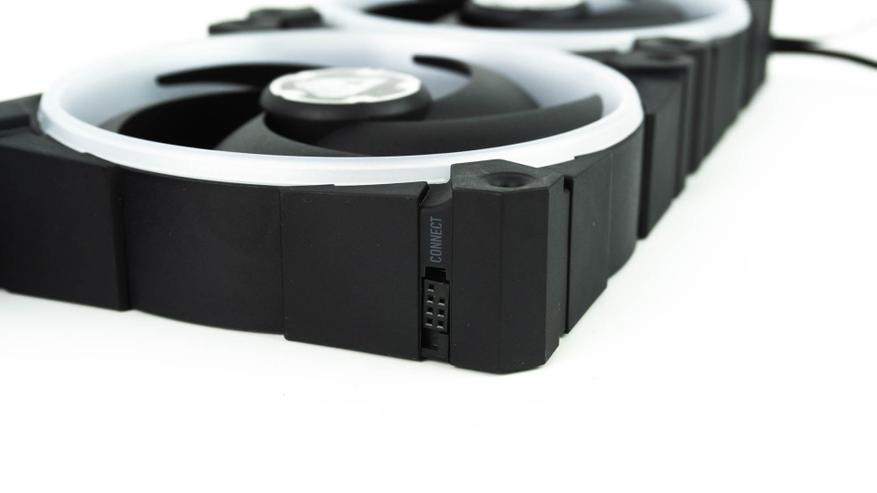На правой и левой боковых гранях, ближе к основанию, расположен разъём для подключения совмещённого кабеля питания и подсветки. С практической точки зрения это огромный и жирный плюс в сторону выбора данных вентиляторов. Благодаря возможности замены стандартного кабеля на двухсторонний коннектор, пользователь может устанавливать корпусные вентиляторы Arctic BioniX P120 A-RGB как по отдельности, так и в качестве полноценной системы, без потери напряжения в цепи. Также в комплект поставки входят соединительные кабели, которые по факту выполняют ту же функцию что и коннектор. Но в этом случае появляется возможность разместить вентиляторы не вплотную, а, например, на небольшом расстоянии друг от друга или на двух прилегающих сторонах корпуса.