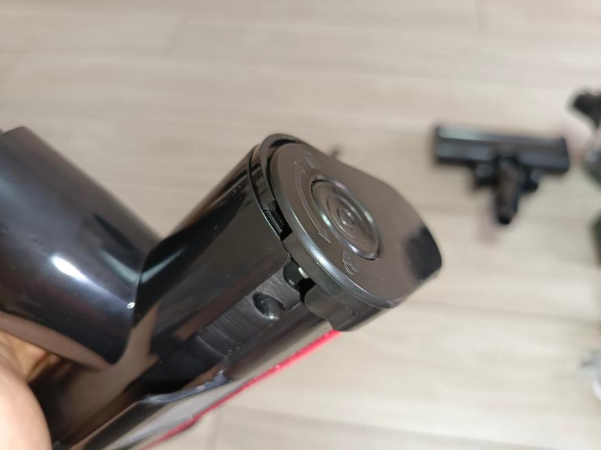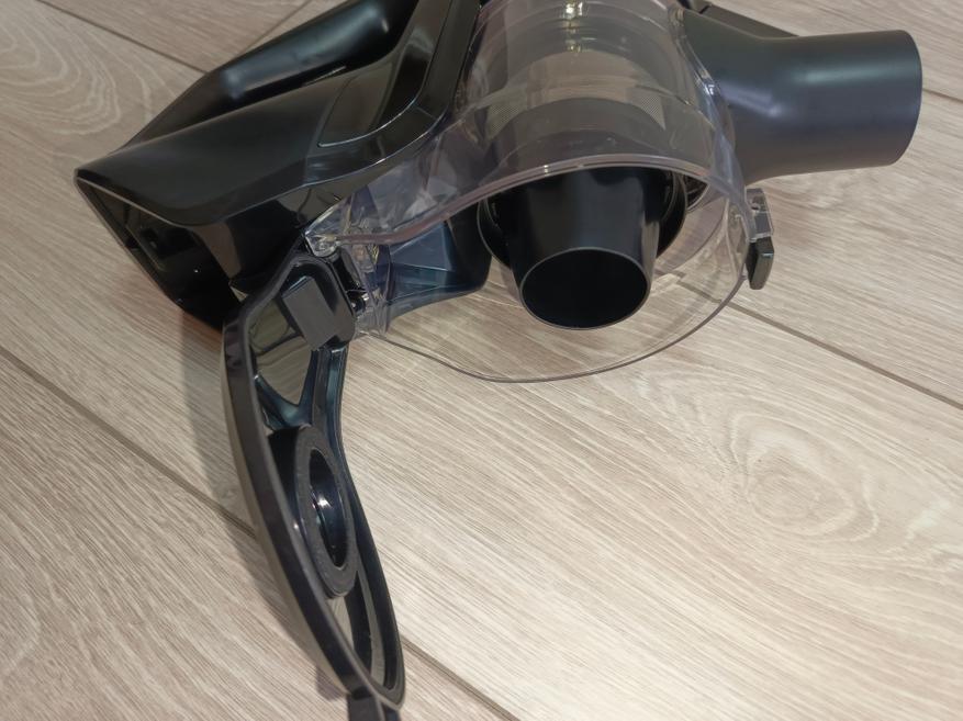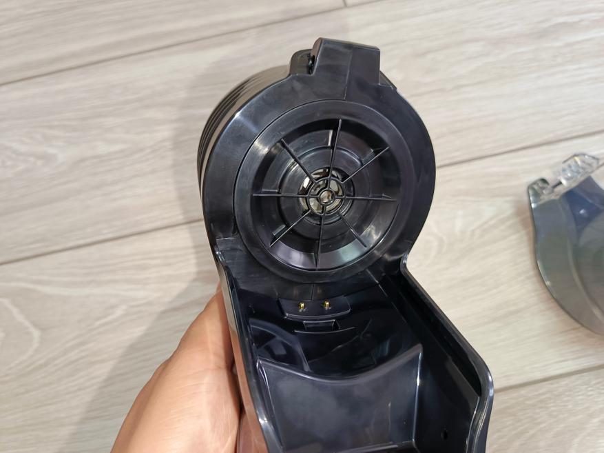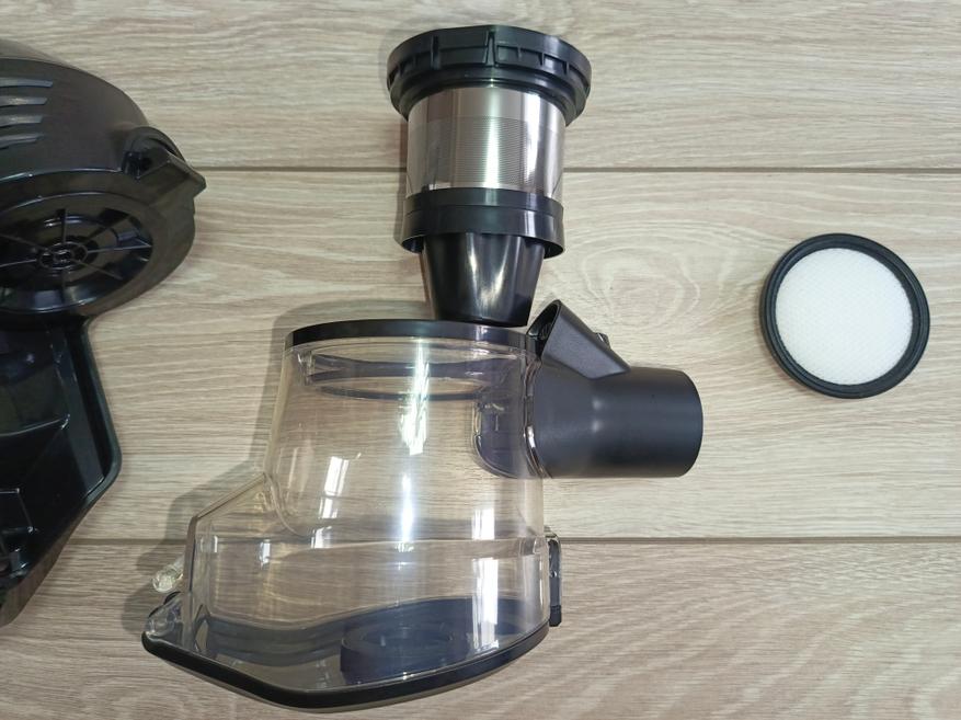 Основной блок пылесоса классической формы для вертикального модельного ряда. Для сбора мусора используется сменная чаша, состоящая всего из четырёх деталей. Конструкция продумана так, что все элементы легко разбираются и быстро очищаются. Внутри установлен HEPA-фильтр, обеспечивающий тонкую очистку воздуха. В комплект также входит запасной фильтр — приятный и полезный бонус, ведь найти аналогичную модель отдельно бывает непросто из-за её нестандартной формы. Средний срок службы одного фильтра составляет около года, однако всё зависит от частоты использования пылесоса и степени загрязнения окружающей среды.