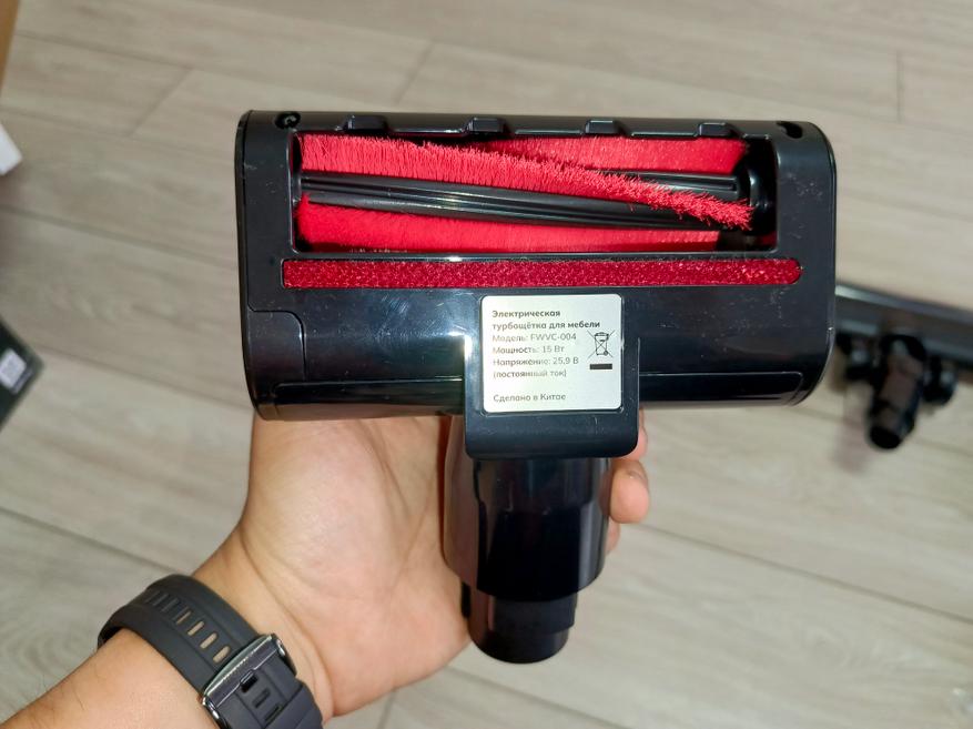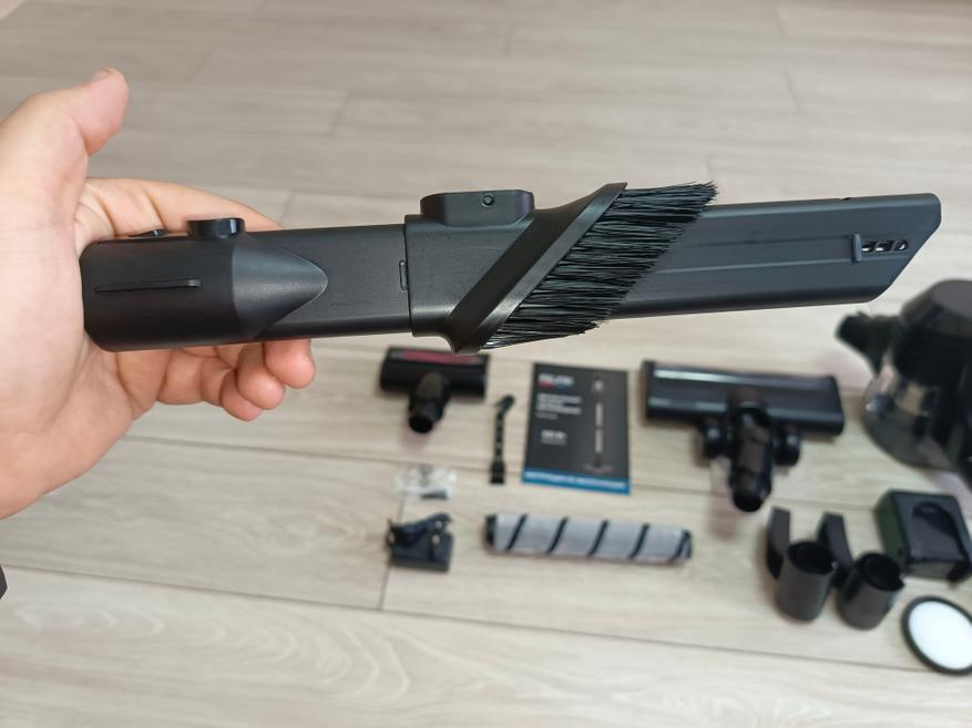 Вторая щетка, предназначенная для уборки мебели и обивки, также оснащена моторизированным приводом, обеспечивающим эффективное удаление пыли, шерсти и мелкого мусора с мягких поверхностей. Однако, в отличие от основной насадки, она не имеет светодиодной подсветки и шарнирного механизма, поэтому немного уступает в маневренности.