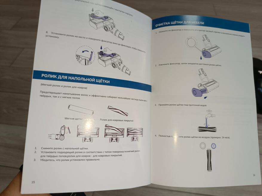 Для чистки или замены щетку можно легко извлечь: достаточно нажать на фиксатор и открыть боковую крышку. В комплекте предусмотрена универсальная щетка для большинства типов покрытий, а также отдельный валик, специально разработанный для эффективной уборки твердых поверхностей.