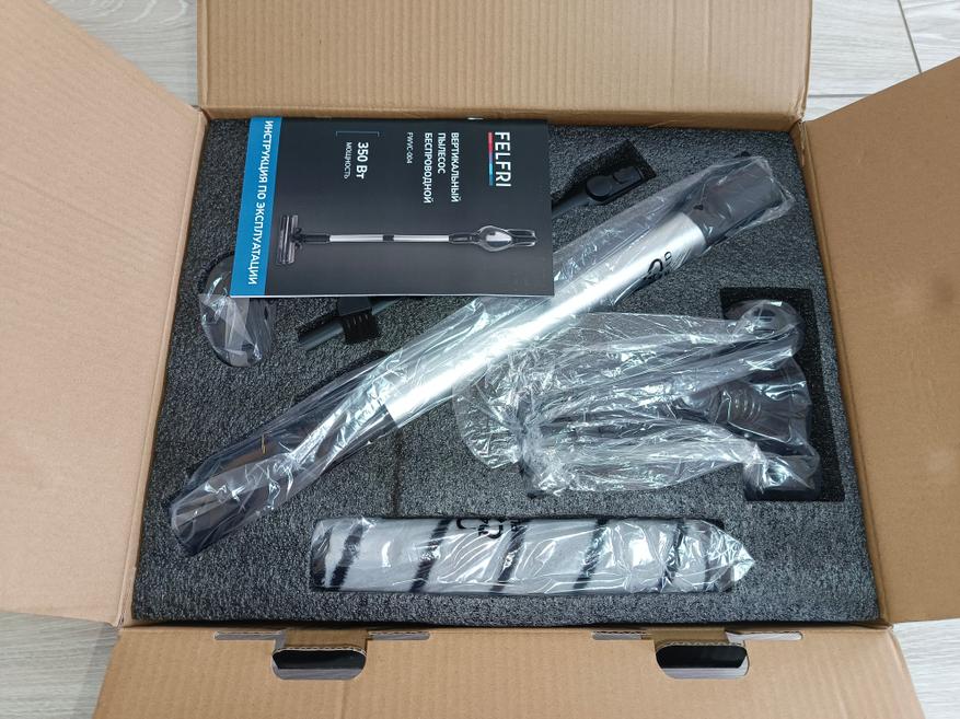 Пылесос поставляется в фирменной коробке, выполненной из прочного, плотного картона, обеспечивающего надежную защиту при транспортировке. Внутри все комплектующие аккуратно размещены и надежно зафиксированы между слоями поролона, что предотвращает их повреждение. В комплект поставки входят: