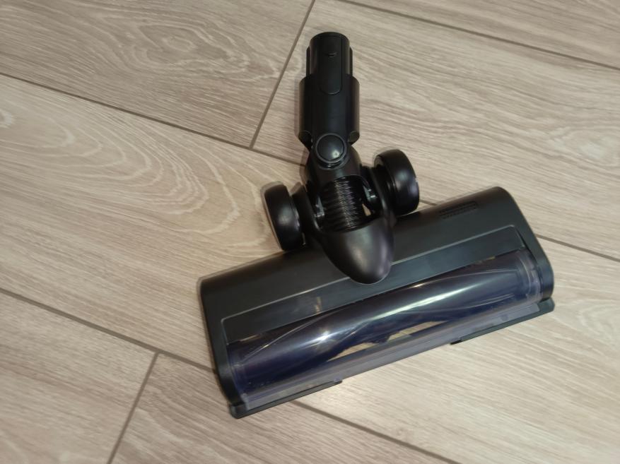 Основная насадка оснащена встроенным электродвигателем, который приводит в движение вращающуюся щетку, значительно повышая эффективность уборки. В отличие от моделей без мотора, где пыль и мусор втягиваются исключительно за счет силы всасывания, здесь вращение щетки активно подхватывает грязь и направляет её прямо в трубу пылесоса. Это заметно ускоряет процесс и обеспечивает более тщательный результат.