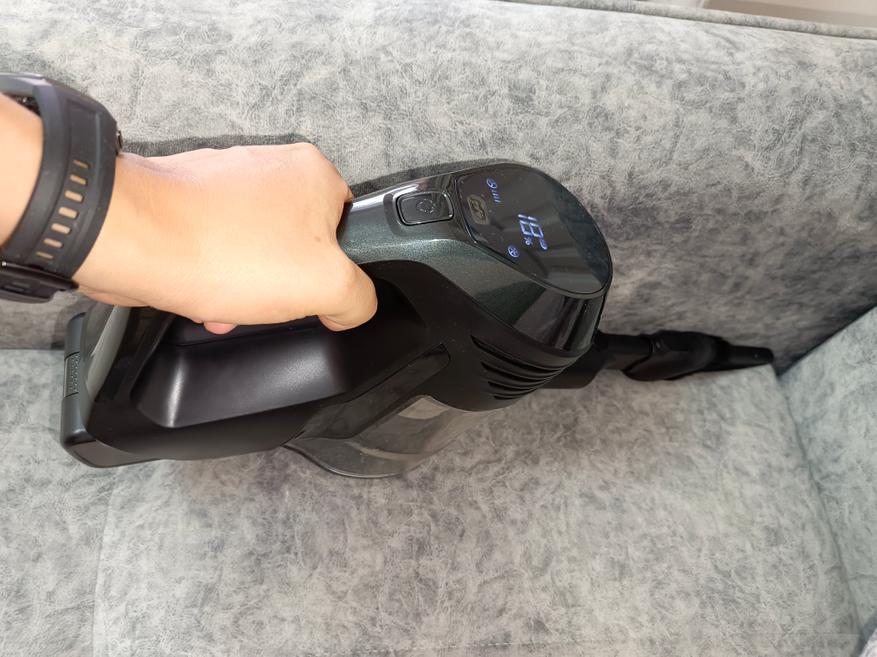 Управление пылесосом сосредоточено на рукояти, при этом предусмотрены всего две механические кнопки для простоты эксплуатации. Первая кнопка отвечает за включение и выключение устройства, а вторая позволяет регулировать уровень мощности всасывания. Всего предусмотрено три уровня мощности, и именно от выбранного уровня зависит продолжительность работы пылесоса на одном заряде. На минимальной мощности устройство способно работать до 40 минут, тогда как на максимальной мощности время работы сокращается до 14 минут. На дисплей выводится наглядная шкала текущего уровня мощности, а также оставшийся процент заряда аккумулятора, что позволяет всегда контролировать состояние батареи.
